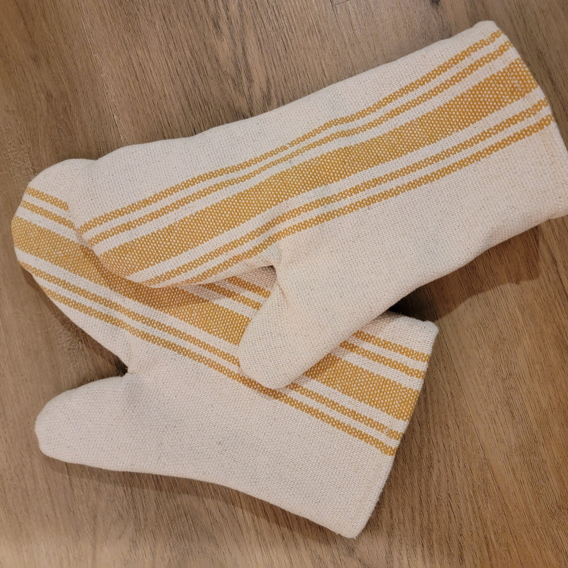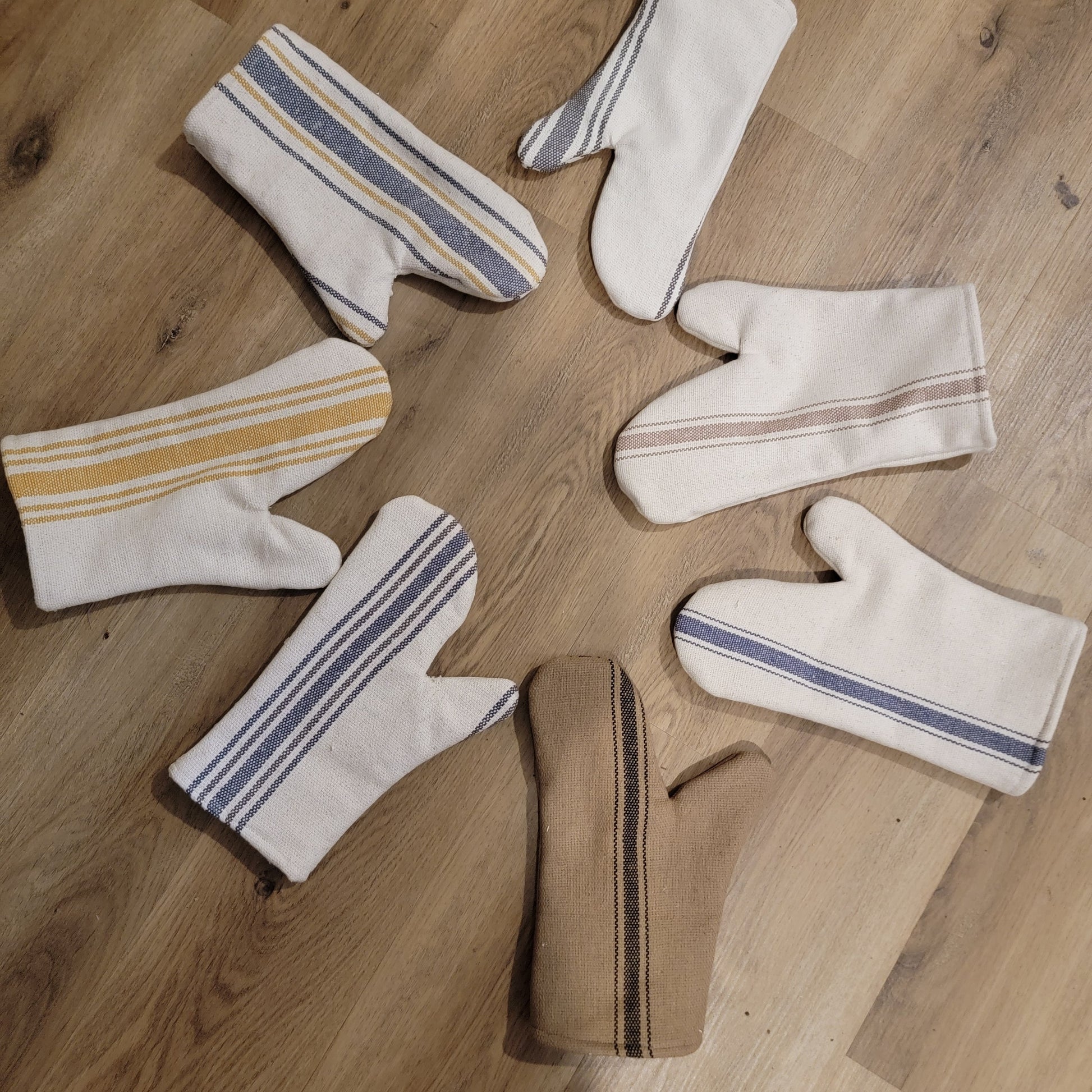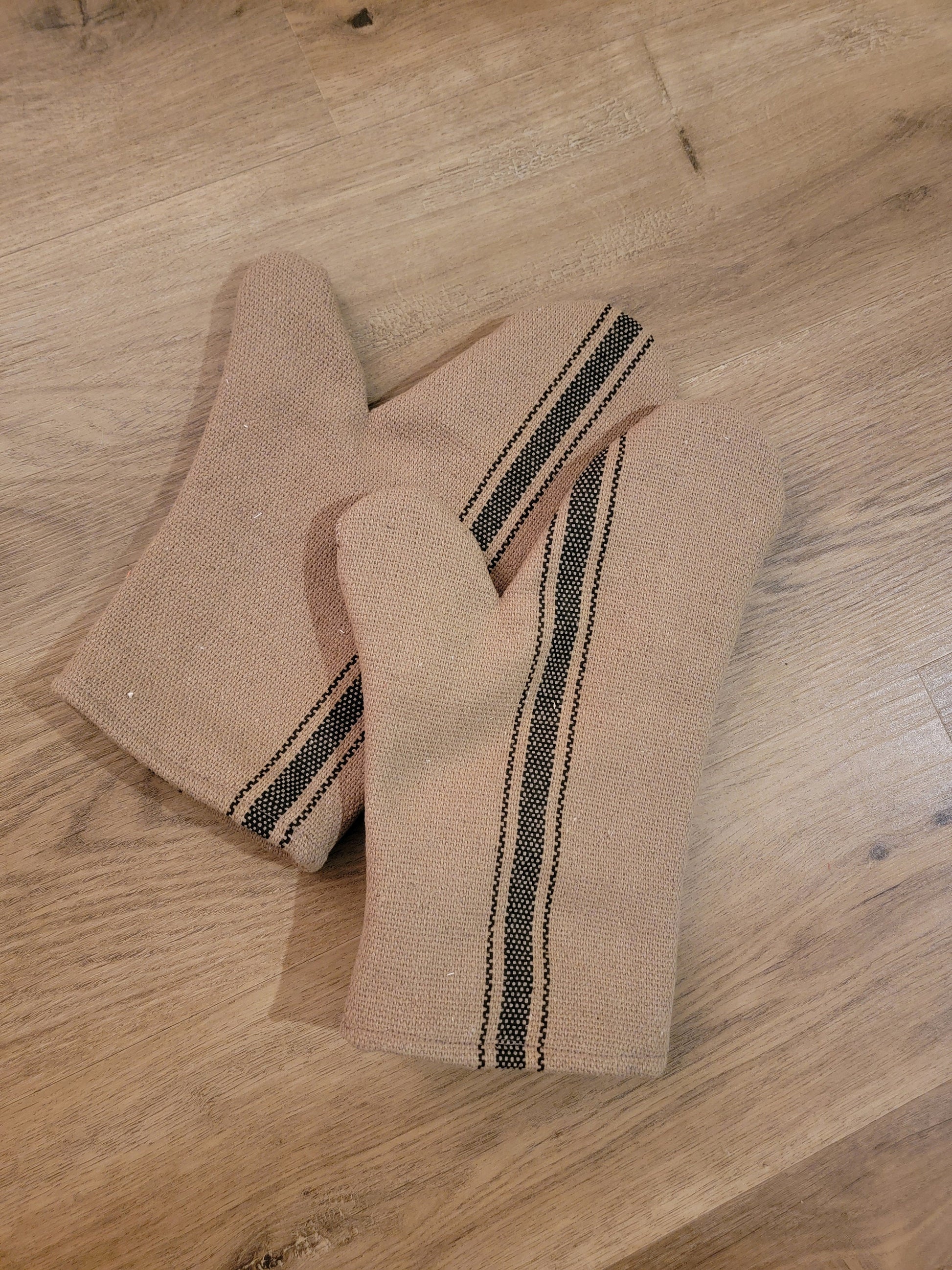 Oven Mitts in our made vintage inspired grain sack.The stripes are woven in this fabric. Oatmeal background in color 70% cotton and 30% polyester.
